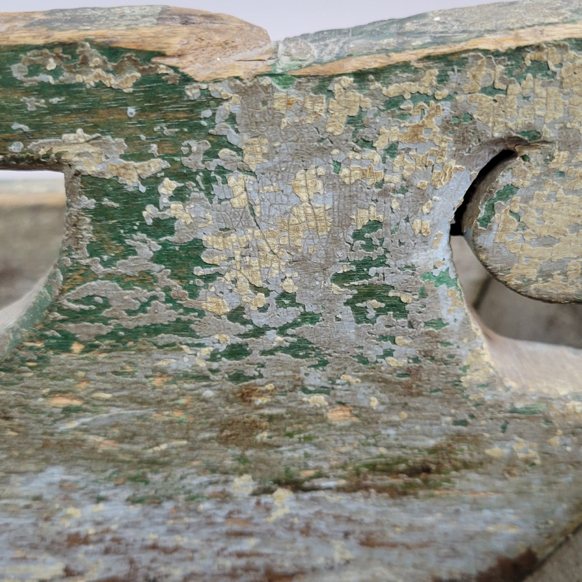 The surface retains a layered paint history, with a dark green ground emerging beneath an early cream overpaint. Over time the paint has worn to a dry, stable craquelure that speaks to two centuries of use. Interior oxidation and wear are consistent with the original function of the piece.