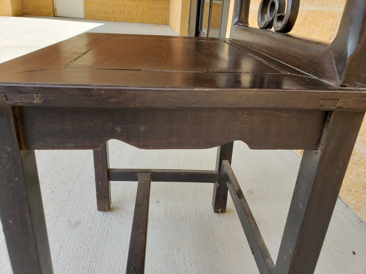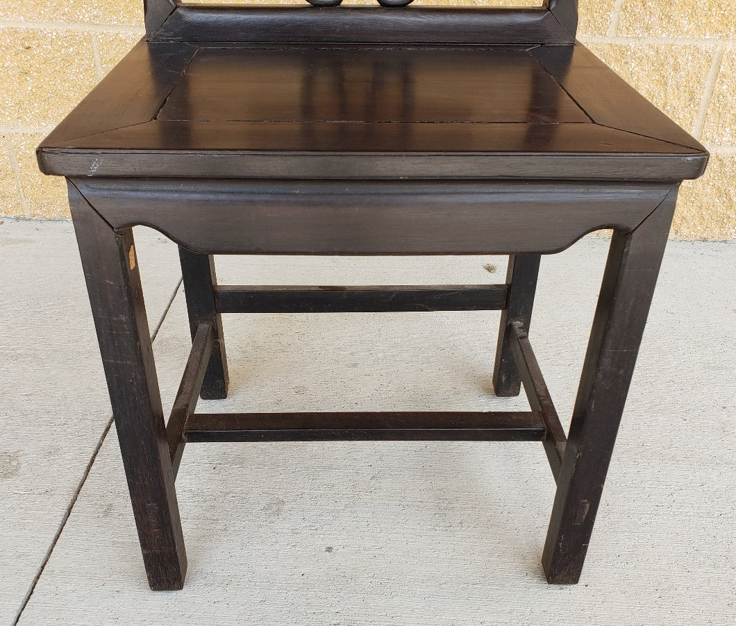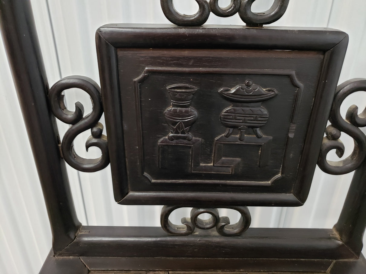 Zitan attributions are common on dark Chinese furniture, but true zitan (Pterocarpus santalinus) is exceptionally dense, with minute pores and subtle purplish undertones. Most “blackwood” chairs of this form are in fact elm or other northern hardwoods stained to a deep black, as in this piece. The carved ding and gui motifs symbolize status, ritual propriety, and abundance—auspicious themes that made such chairs a favored choice for scholar’s studios.